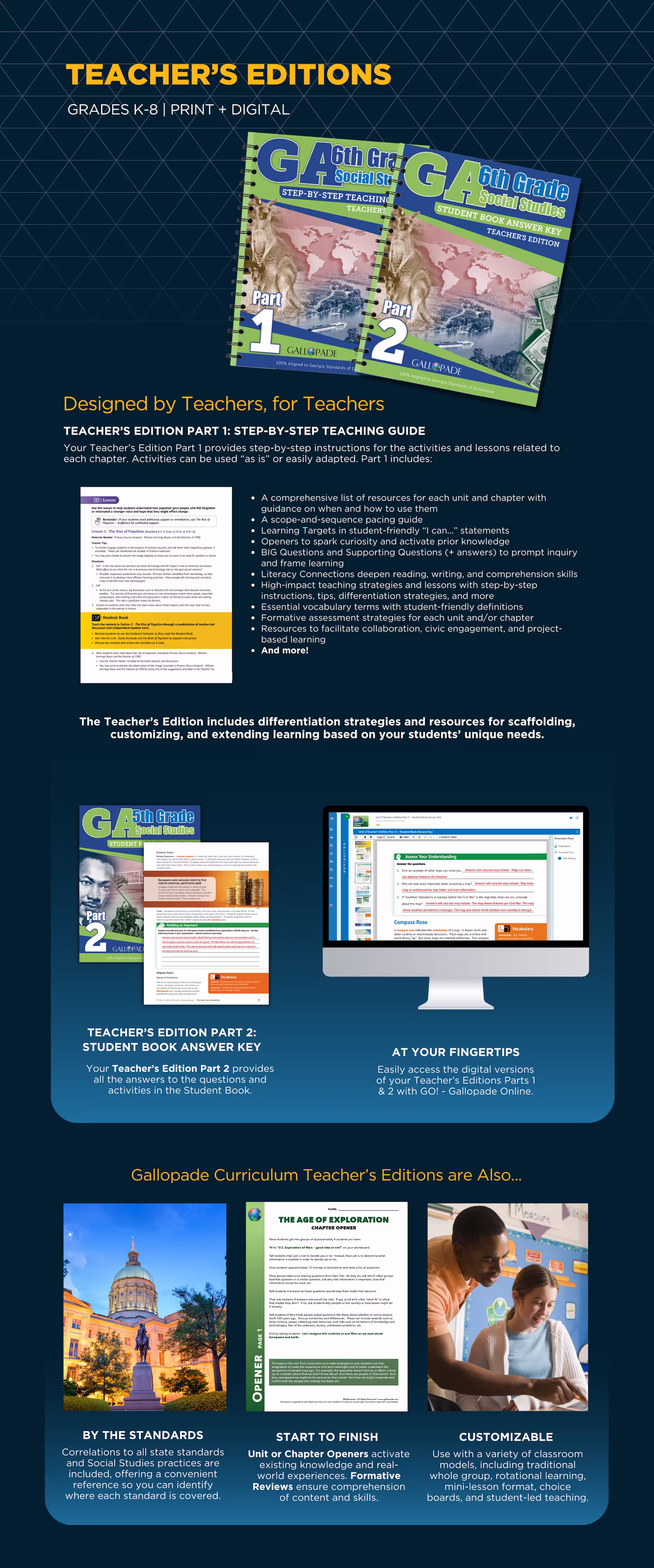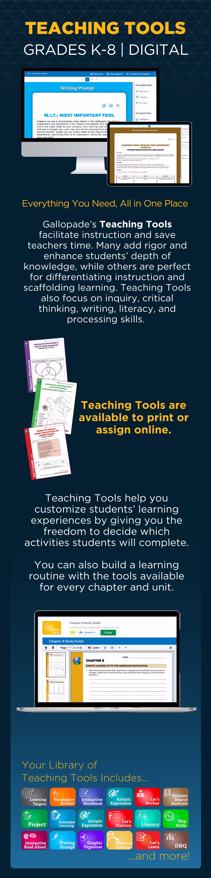 Step-by-step lessons, abundant resources, and purposeful activities support an engaging and interactive learning experience, while also giving teachers the flexibility and tools to differentiate instruction to help every student succeed. All elements of Gallopade Curriculum work together to create an effective, easy-to-use program.