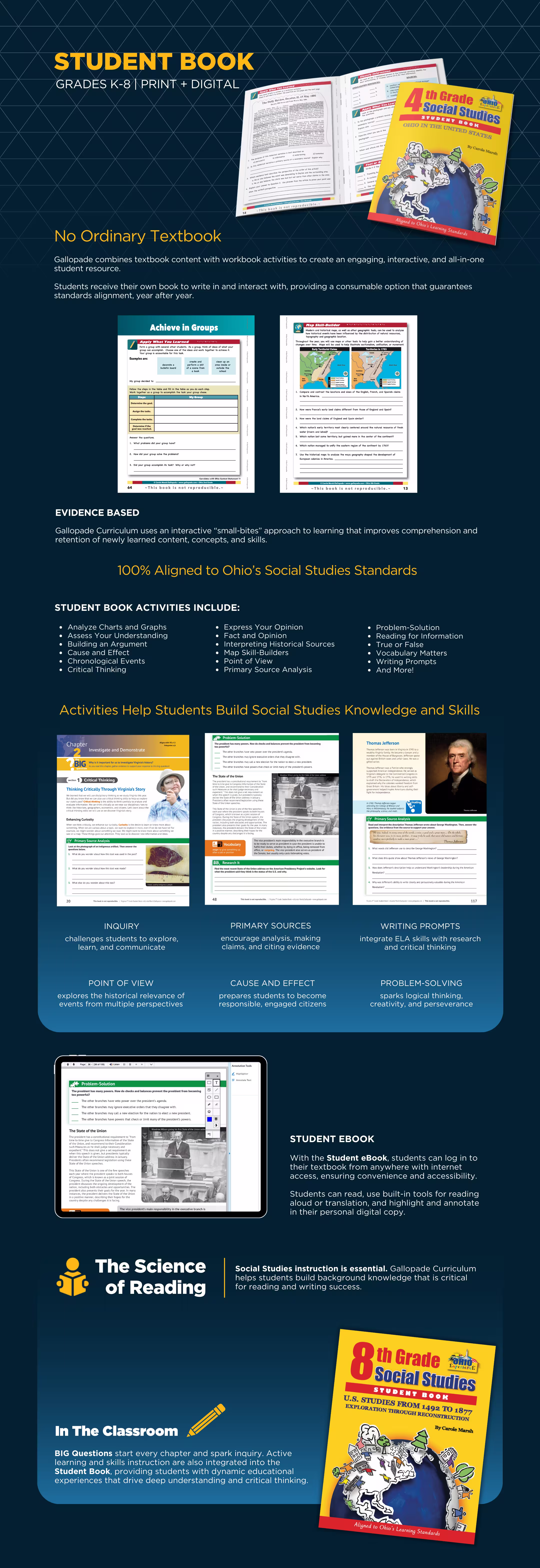 With Gallopade Curriculum, you’ll be prepared to guide students through a customized learning experience, positively impacting their mastery of the standards and helping them prepare for college, career, and civic success.